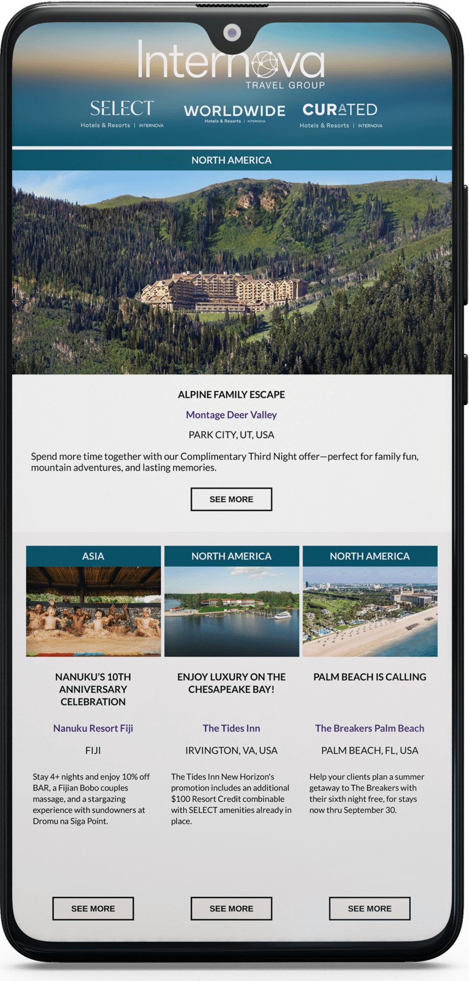 Monthly multi-supplier E-Newsletters are deployed to Internova Travel Group's network of 100,00 advisors, including owners, managers, and front line advisors.
