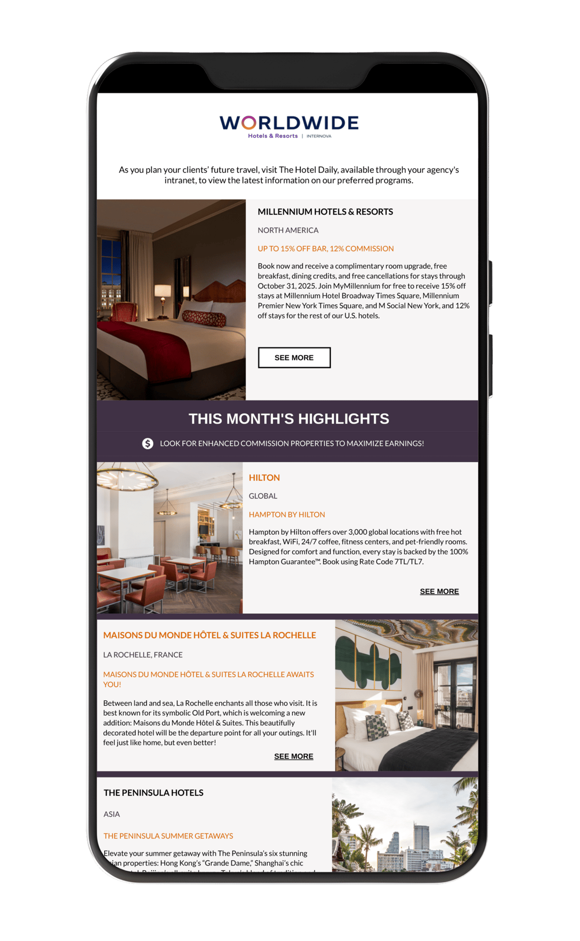 Amplify your brand awareness with a highlight on our private Facebook group reaching engaged Internova Travel Group advisors. Choose a social media post with impactful visuals and detailed caption or showcase your property or brand with a stunning image featured as the channel's cover photo.
