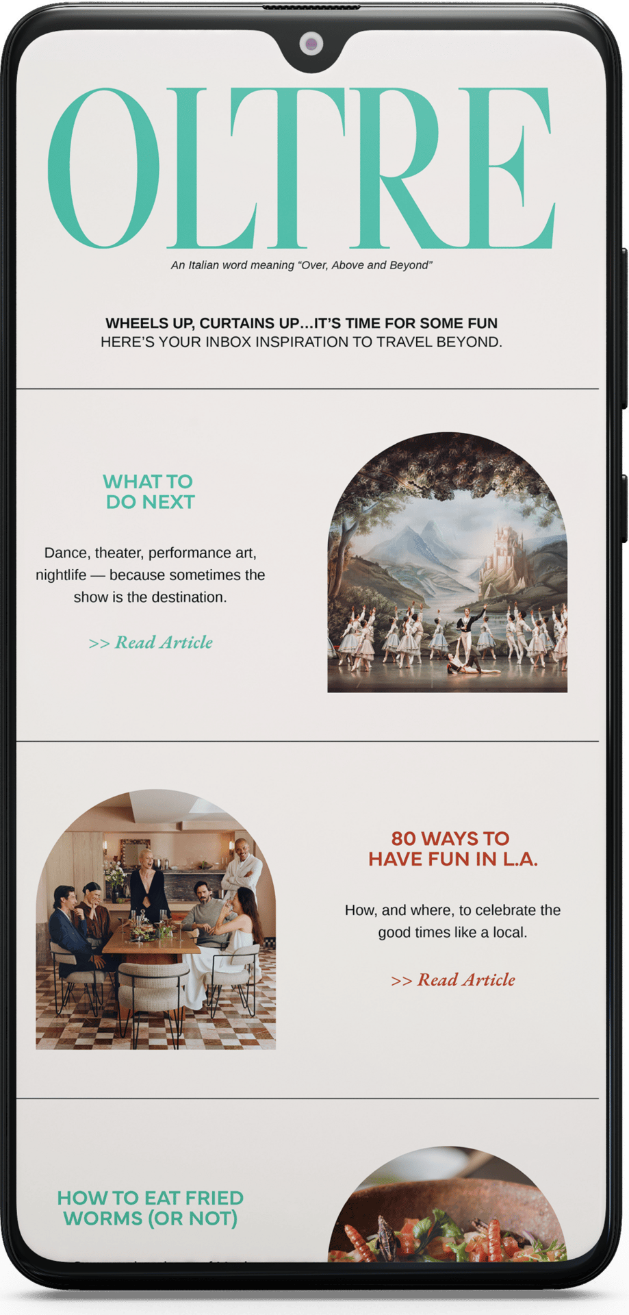 OLTRE is designed to showcase your brand, connect you with affluent, proven travelers on myriad lifestyle interests and inspire them to plan their next trip. We focus on the why of travel, not just the how. Art, design, music and culture are blended throughout, and luxury fashion brands are incorporated in unexpected ways.